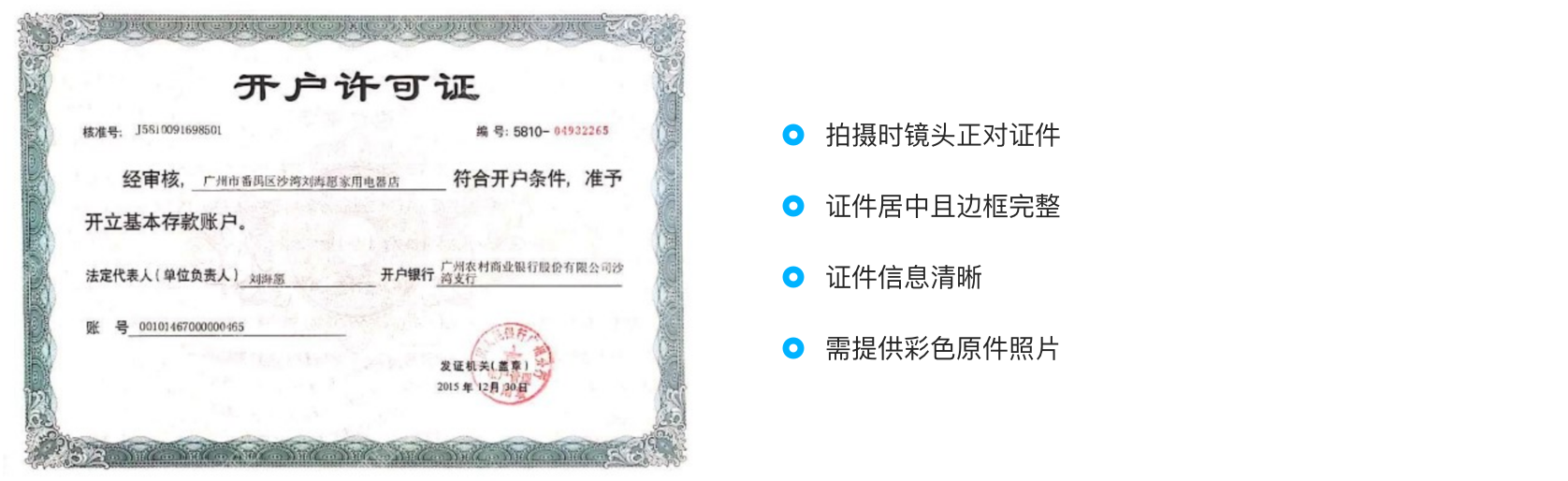企业工商户:公司对公账户开户许可证或银行回单照片