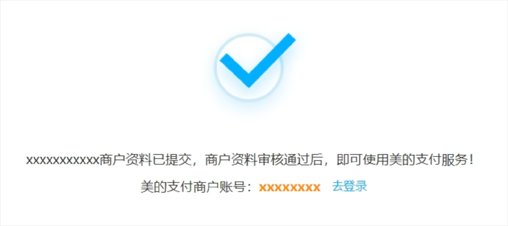 注册完成后,商户资料会进入后台审核,审核时间约1-5天,审核通过后可使用美的支付产品,请耐心等待。